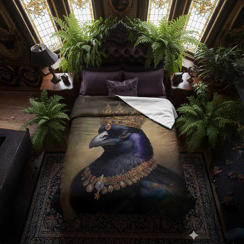 A rich portrait of a raven crow wearing a jeweled crown featured on a plush velveteen throw blanket, giving a luxurious and elegant vibe. Perfect for cozying up on cold nights or adding a touch of opulence to a room. Ideal for adults and relevant for Halloween, Gothic-themed events, or as a unique home decor piece.