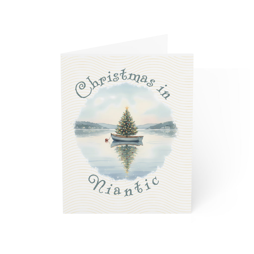 Celebrate Christmas in Niantic Connecticut by sending greeting cards featuring a dinghy boat with a Christmas tree floating in a harbor..