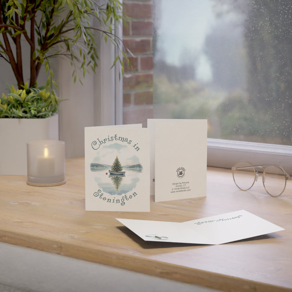 Celebrate Christmas in Stonington Connecticut or Maine by sending greeting cards featuring a dinghy boat with a Christmas tree floating in a harbor..