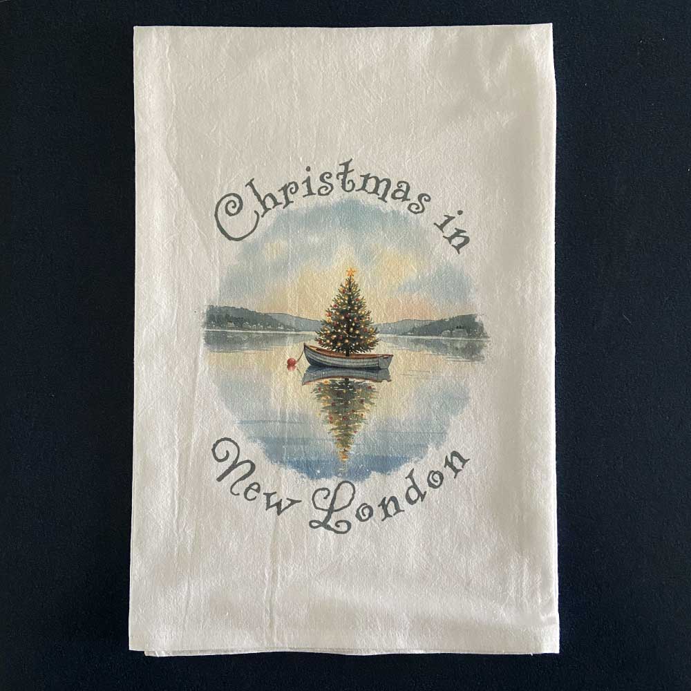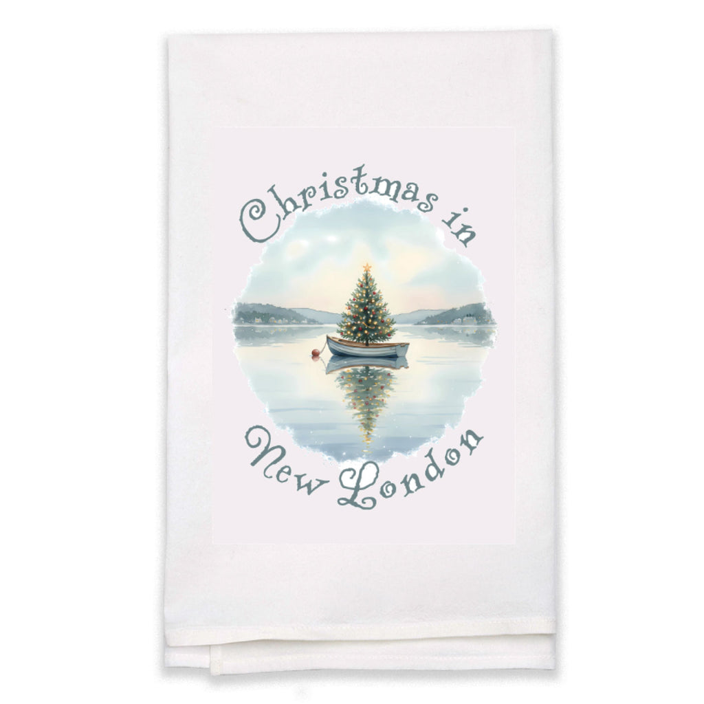 Christmas in New London, CT Flour Sack Kitchen Towel, Floating Xmas Tree in Boat