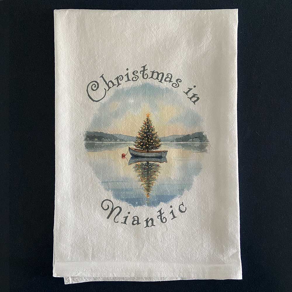 Christmas in Niantic Flour Sack Kitchen Towel, Floating Xmas Tree in Boat