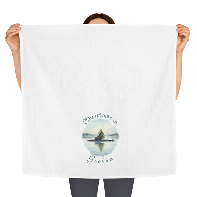 Celebrate Christmas in the 'Submarine Capital of the World, Groton, CT, with this tea towel featuring a submarine with a Christmas tree floating in a harbor. Made from 100% cotton. The absorbent and fast-drying material ensures efficiency, making meal prep and clean-up easier than ever. It’s a delightful gift for cooking enthusiasts or anyone who enjoys spending time in the kitchen. This tea towel makes a fantastic addition to holiday gatherings, or even as a thoughtful gesture during the winter season.