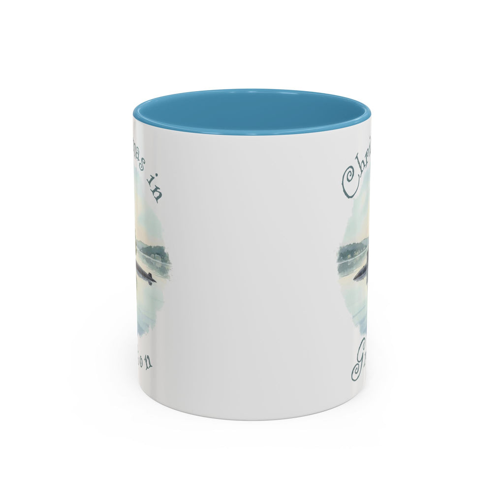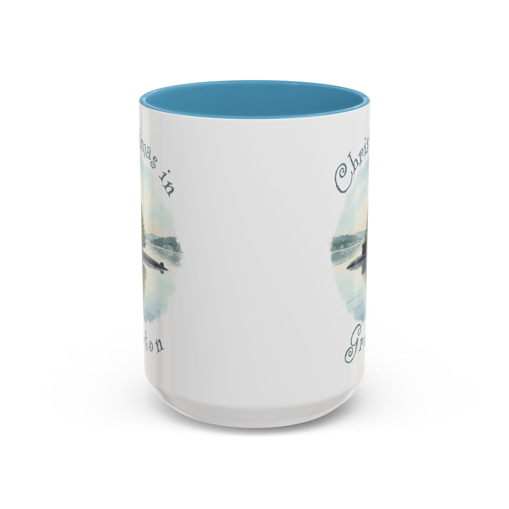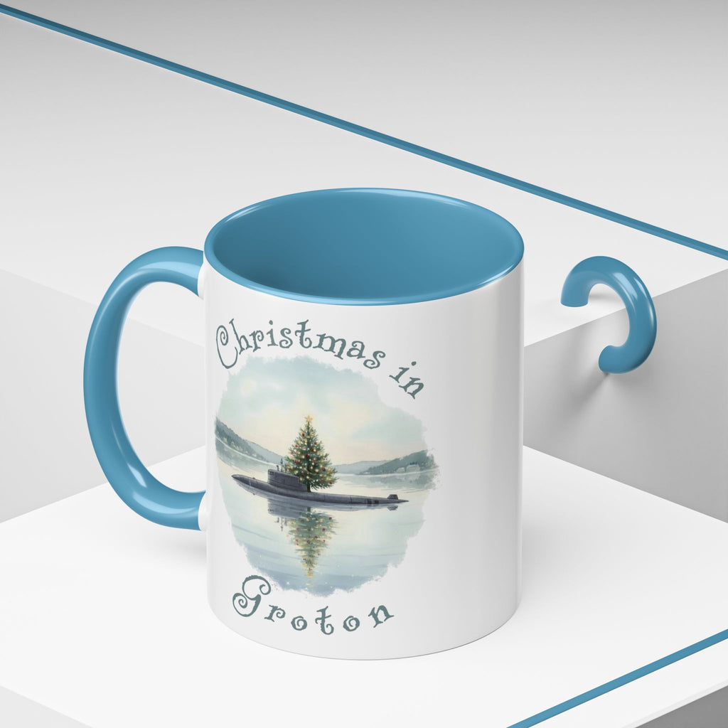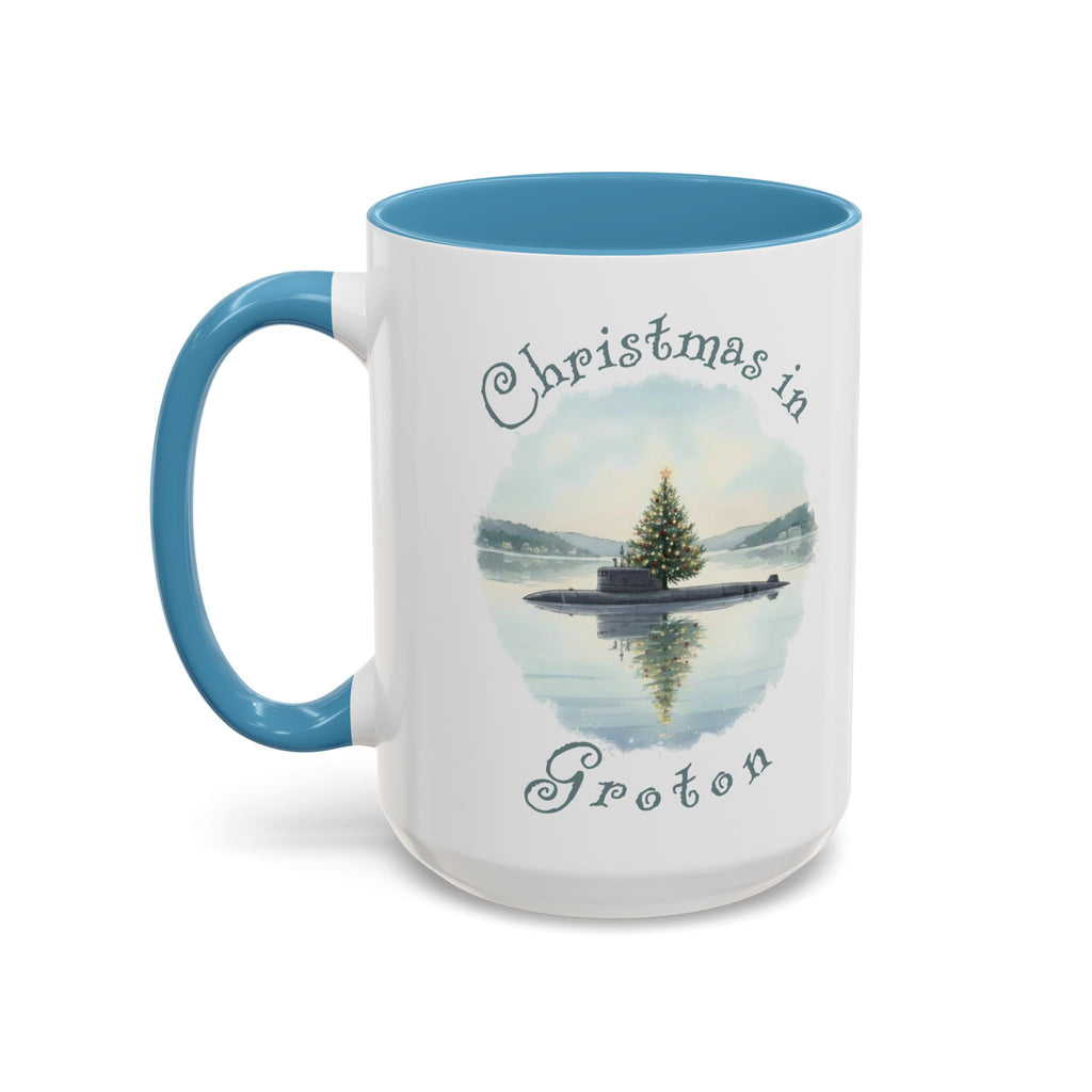 Celebrate Christmas in the 'Submarine Capital of the World, Groton, CT, with this blue accent coffee mug featuring a submarine with a Christmas tree floating in a harbor. Perfect for adding a festive touch to your home or office decor during the holiday season. Ideal gift giving for Naval Submarine Base New London, General Dynamics, Electric Boat, and the U.S. Submarine Force Museum workers and friends.