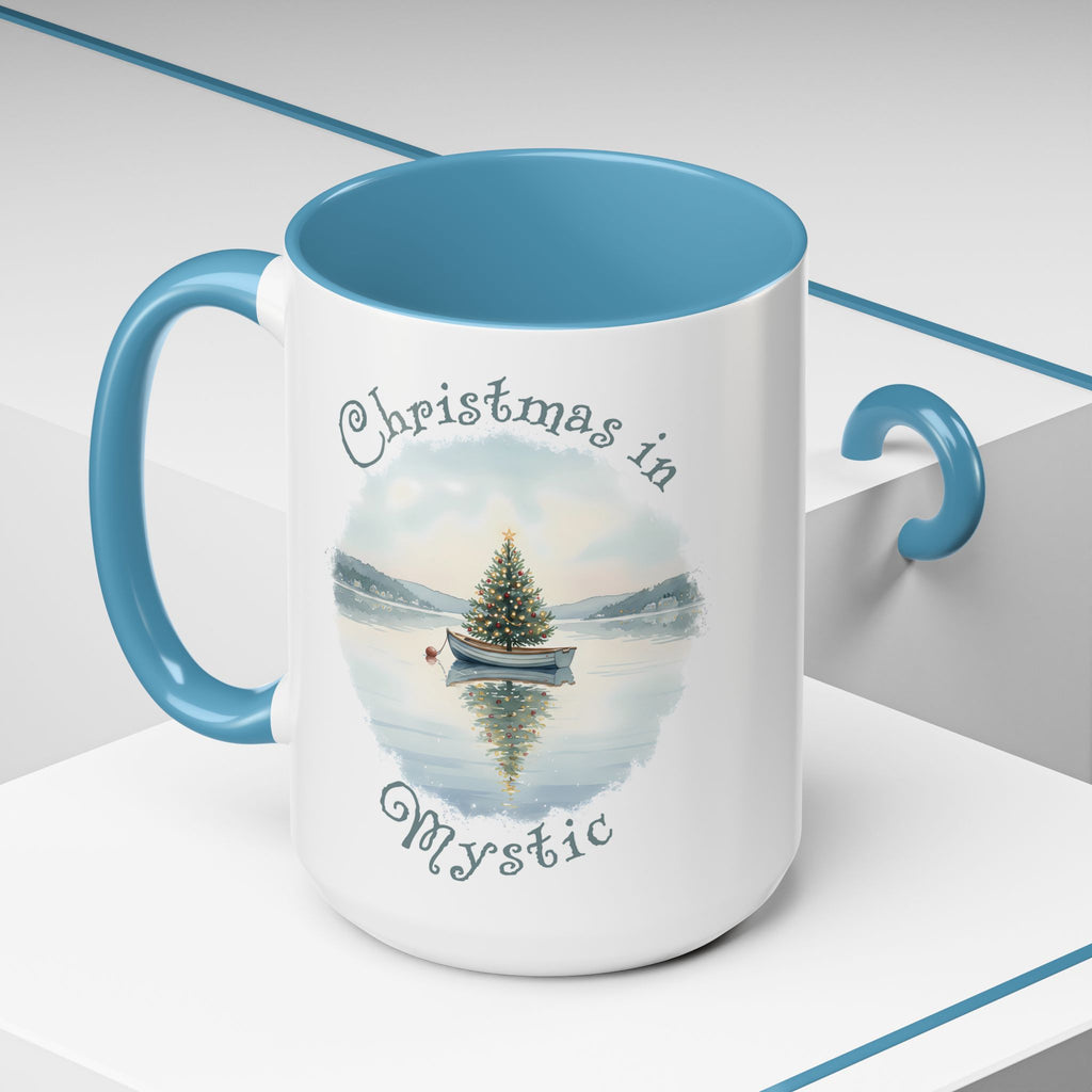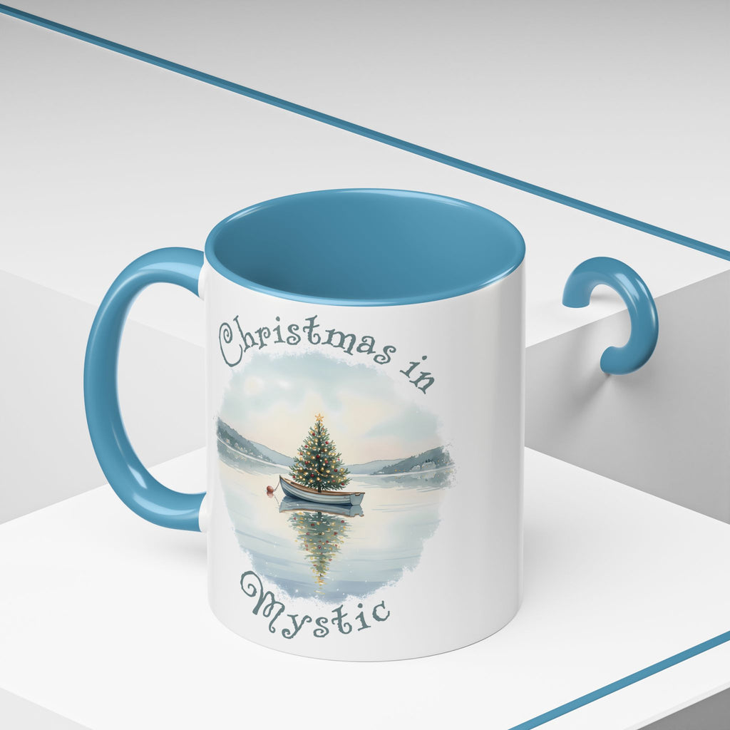 Christmas in Mystic, CT Accent Coffee Mug - Dinghy Boat with Xmas Tree in Harbor, Local's Gift