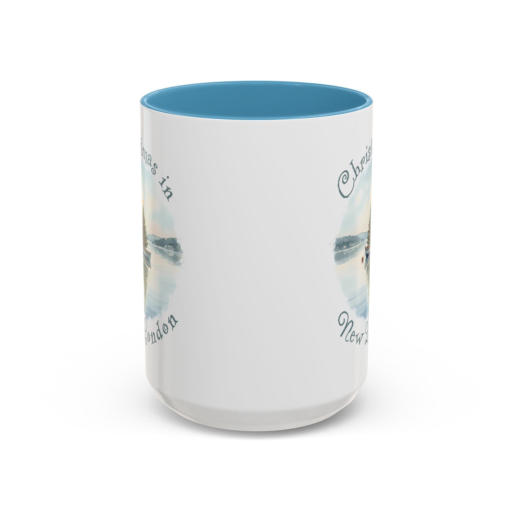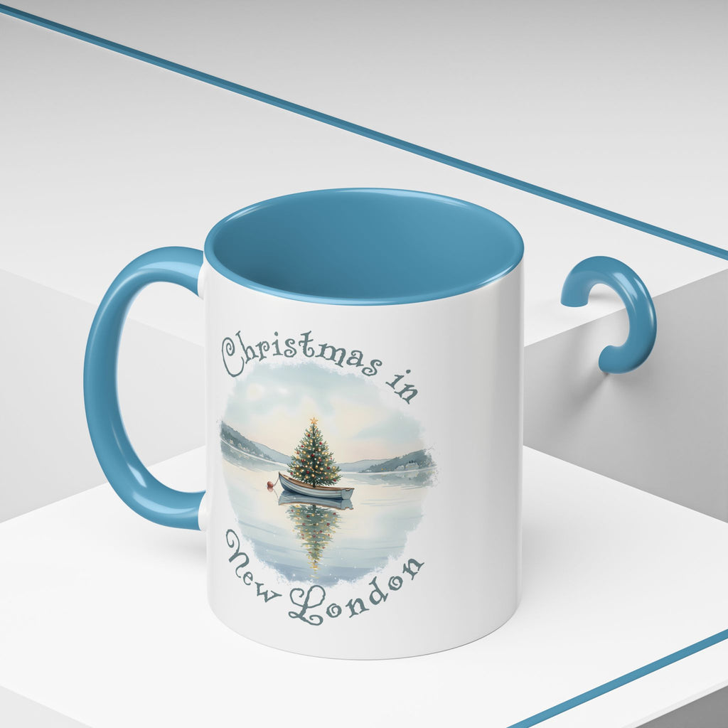 Christmas in New London, CT Accent Coffee Mug - Dinghy Boat with Xmas Tree in Harbor, Local's Gift