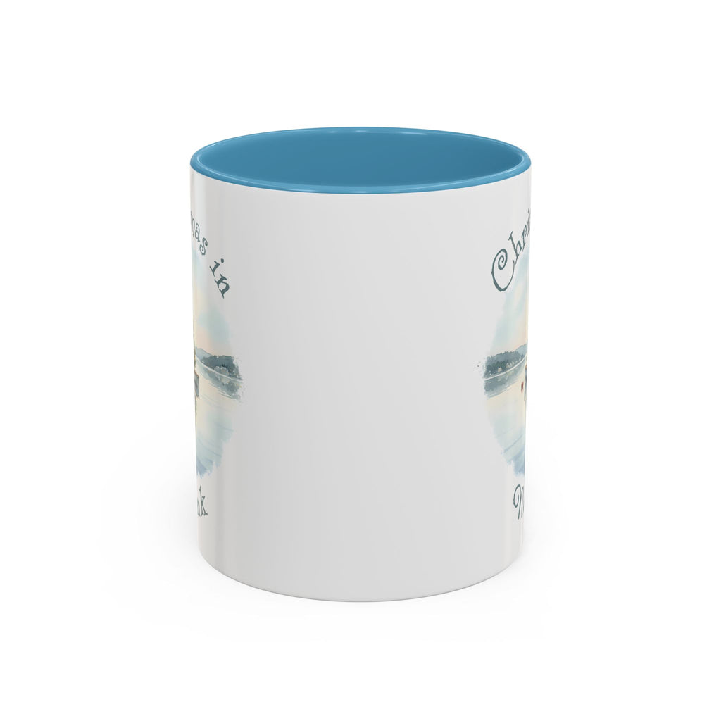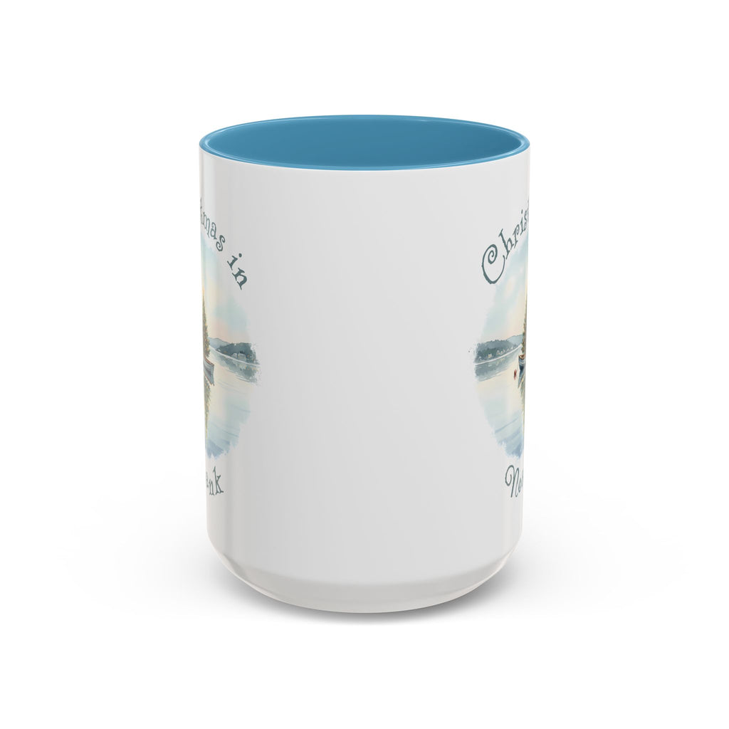 Experience the coastal holiday vibes with this Christmas in Noank, CT accent coffee mug featuring a dinghy boat with a Christmas tree floating in a harbor. Perfect for adding a festive touch to your home decor during the holiday season. Ideal for Eastern Connecticut Shoreline families looking to create a warm and joyful atmosphere during Christmas celebrations.