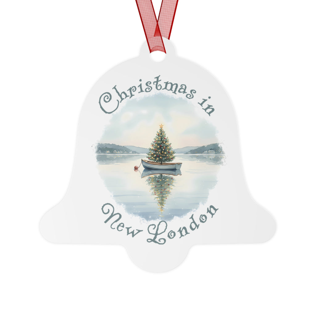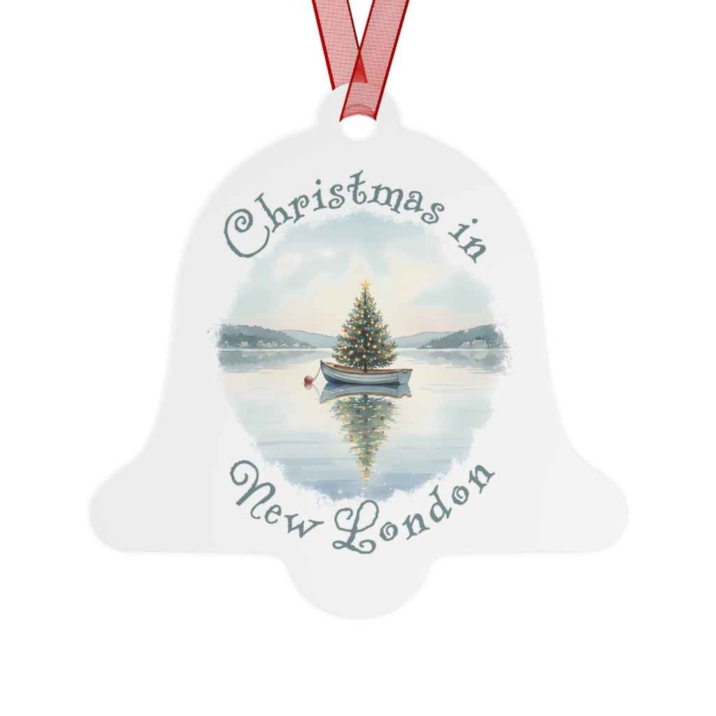 Experience the coastal holiday vibes with this Christmas in New London, CT metal ornament featuring a dinghy boat with a Christmas tree floating in a harbor. Perfect for adding a festive touch to your home decor during the holiday season. Ideal for Eastern Connecticut Shoreline families looking to create a warm and joyful atmosphere during Christmas celebrations.