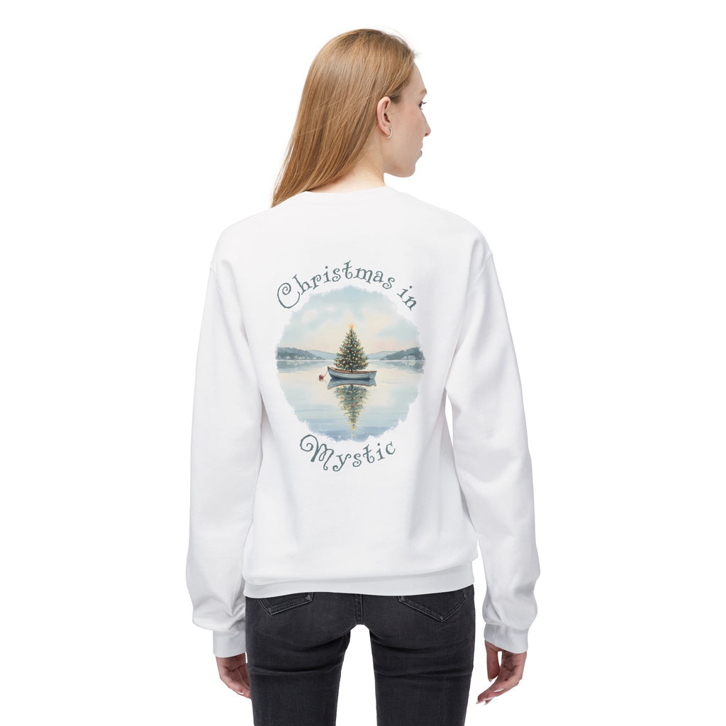 Celebrate Christmas in Mystic Connecticut with this lightweight sweatshirt featuring a dinghy boat with a Christmas tree floating in a harbor. Double-sided print.