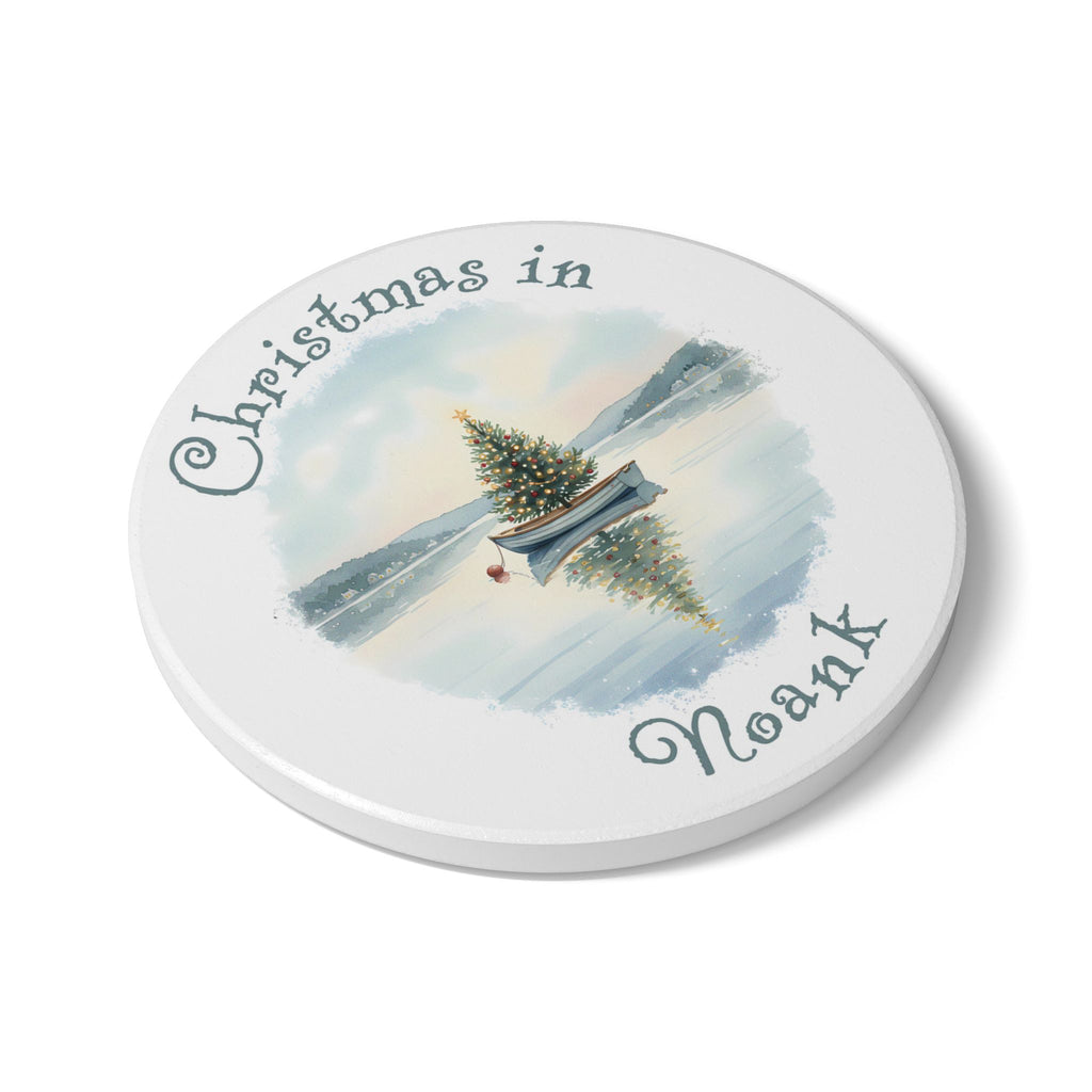 Experience the coastal holiday vibes with this Christmas in Noank, CT ceramic coaster featuring a dinghy boat with a Christmas tree floating in a harbor. Perfect for adding a festive touch to your home decor during the holiday season. Ideal for Eastern Connecticut Shoreline families looking to create a warm and joyful atmosphere during Christmas celebrations.